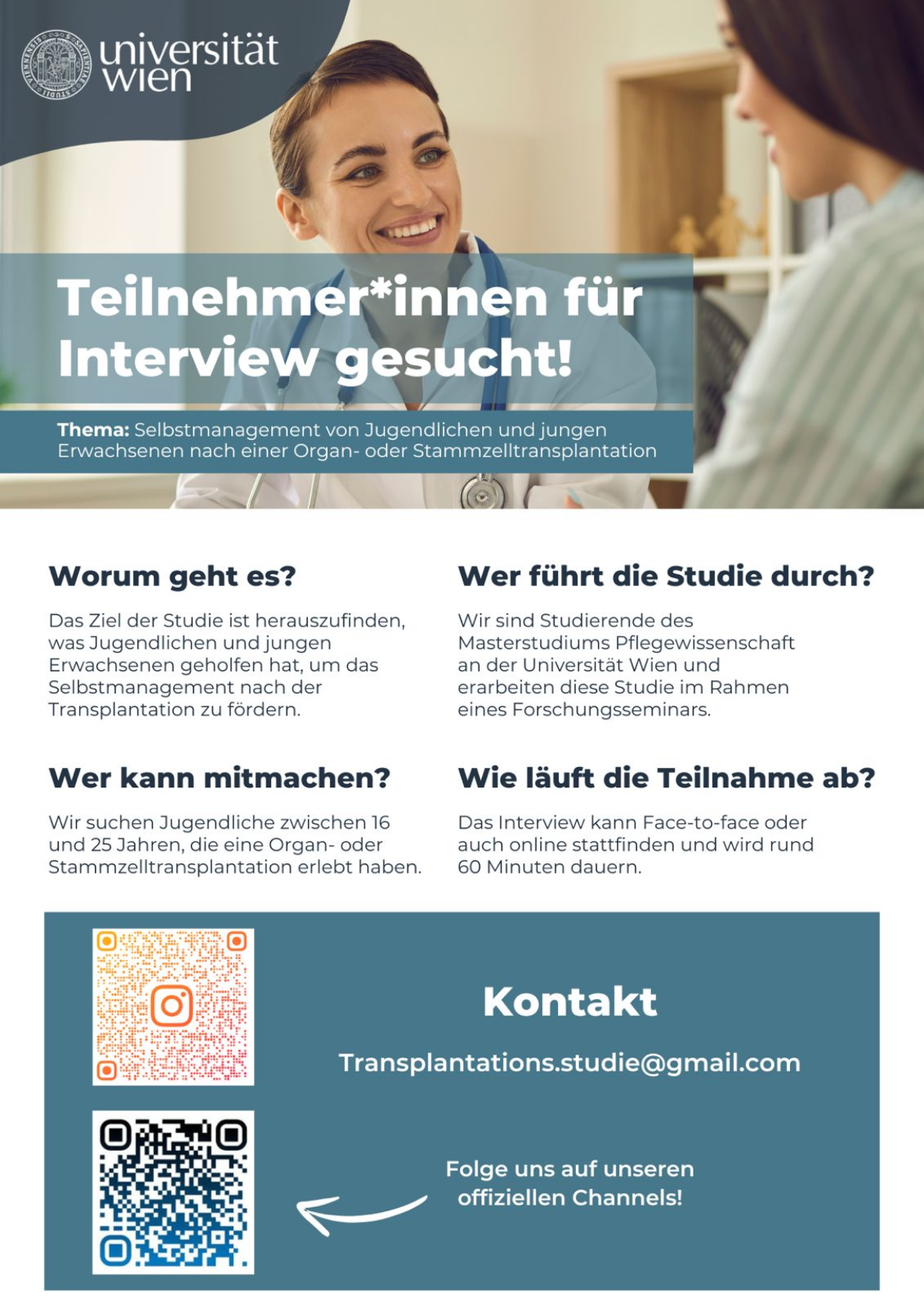 Wir sind vier Studierende im Masterstudium Pflegewissenschaft an der Universität Wien. Im Rahmen eines Seminars führen wir ein Forschungsprojekt zum Thema „Selbstmanagement von Jugendlichen und jungen Erwachsenen nach einer Organ- oder Stammzelltransplantation“ durch. Hierfür sind wir noch auf der Suche nach Teilnehmer*innen und wenden uns daher an Sie. Die geplante Studie soll untersuchen, was Jugendlichen und jungen Erwachsenen geholfen hat, um das Selbstmanagement nach einer Transplantation zu fördern. Der Fokus liegt dabei auch auf der Transition in die Erwachsenenmedizin. Die Erhebung richtet sich an Personen zwischen 16 und 25 (max. 30) Jahren und wird in Form eines Interviews stattfinden. Patrizia Golda, Magdalena Cetnarowska, Lilla Magyar, Felix Staudinger