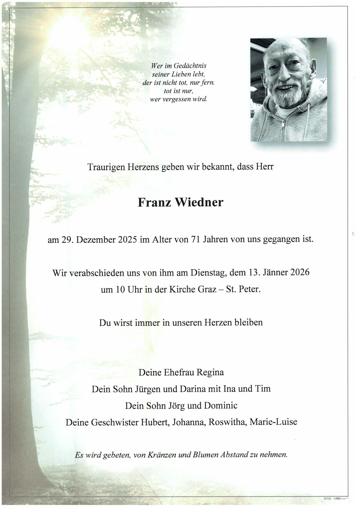In tiefer Anteilnahme möchten wir euch informieren, dass unser Ehrenmitglied FRANZ WIEDNER am 29.12.25 friedlich eingeschlafen ist.